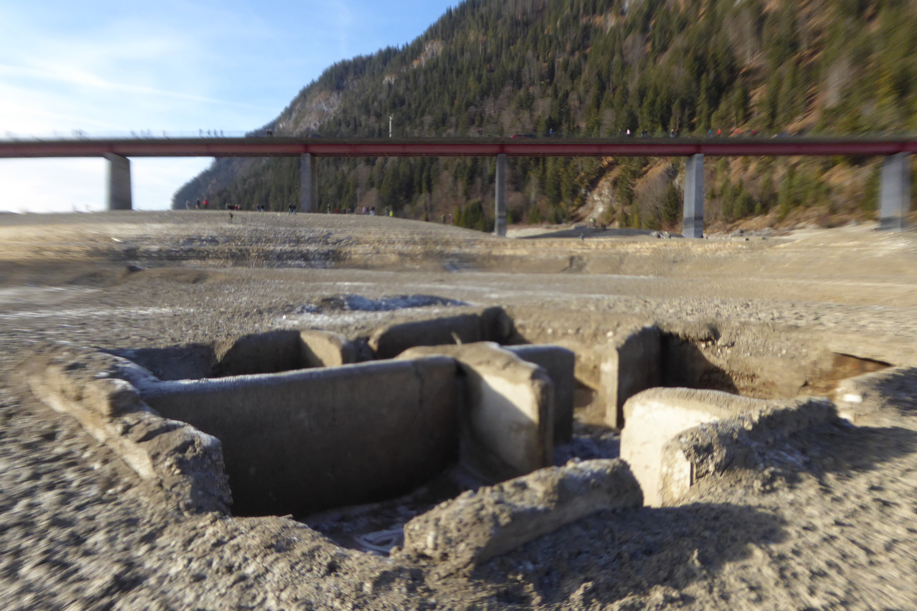 Derzeit, im Dezember 2015, kann man zwischen den Grundmauern der im Jahr 1959 gesprengten Häuser von Alt-Fall inmitten des Sylvenstein-Stausees spazieren gehen. Ganze Karawanen von Schaulustigen sind unterwegs...