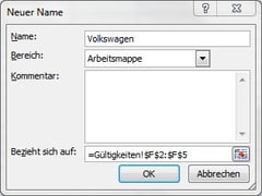 Nun werden den einzelnen Daten- bereichen in den verschiedenen Spalten Namen zugewiesen. Der jeweilige Bereich wird markiert: also z.B. A2:A6. Über den Menü- bereich Formeln \ Definierte Namen\ Namen definieren wird für den Bereich ein Name definiert. Der erste Name ist eigentlich egal, sollte aber "sprechend" sein... in unserem Fall also z.B. "Automarken".